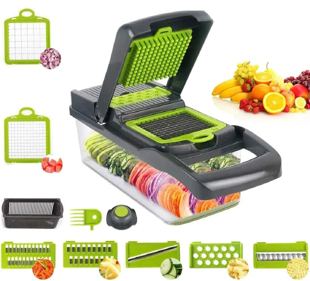Experiencia de cocina conveniente: ¿Está buscando un producto que lo ayude a facilitar su experiencia de cocina y también reduzca el tiempo de preparación de la comida? Este picador de verduras multifunción 8 en 1 fácil de usar será el complemento perfecto para su cocina. ¡También puede usarlo para cortar, rebanar y cortar en cubitos cebollas, zanahorias, papas, tomates, pimientos, varias verduras, frutas, incluso queso y mucho más en segundos! Es así de fácil. Asegúrese de cortar las verduras al tamaño adecuado de 5 cm antes de colocarlas en la cortadora de cubitos.